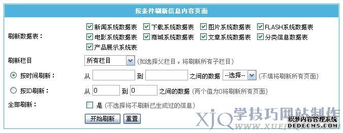 | 刷新数据表 | 选择要生成内容页的数据表。 | | 刷新栏目 | 选择要生成内容页的栏目(如选择父栏目,将刷新所有子栏目)。 | | 按时间刷新 | 生成“增加信息时间”在某一时间段的内容页(不填将刷新所有页面)。 | | 按ID刷新 | 生成“信息ID”在某一ID段的内容页(两个值为0将刷新所有页面)。 | | 全部刷新 | 把已经生成过的内容页也一起更新。 |